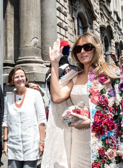 Melania Trump è arrivata a Taormina e ha scelto un look in perfetto stile primaverile per camminare tra le strade siciliane. La First Lady ha infatti sfoggiato un cappottino ricoperto di fiori colorati abbinato alla pochette della collezione Autunno/Inverno 2017-18 di Dolce&Gabbana. Il prezzo del soprabito? Ben 50.000 dollari.