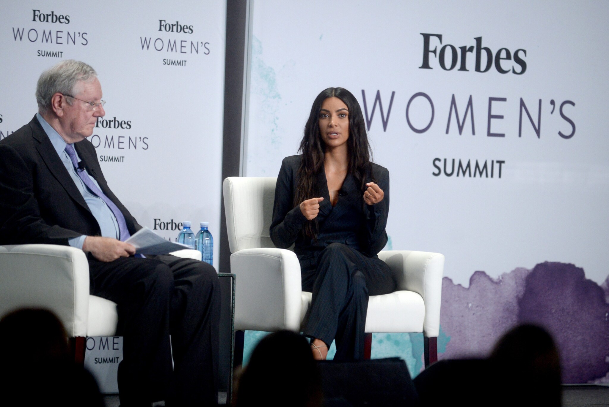 Kim Kardashian ha preso parte ieri al Forbes Women's Summit, un evento che ogni anno celebra le donne del mondo dello spettacolo che si sono distinte per forza e talento. Per l'occasione ha deciso di dire addio agli abiti aderenti e alle gonne fascianti e ha indossato un tailleur dal taglio maschile di raso nero.