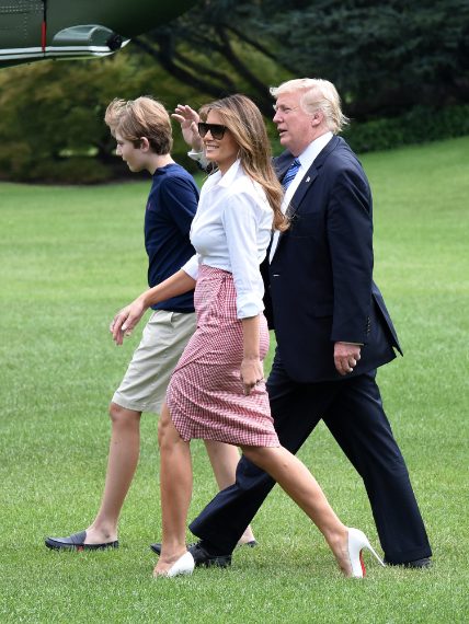 I Trump si sono concessi qualche giorno di vacanza, hanno passato il weekend nella loro tenuta a Bedminster, nel New Jersey, e Melania ha pensato bene di puntare tutto su un look da picnic per il suo arrivo all'aeroporto di Morristown. La First Lady è apparsa elegante con una gonna al ginocchio a quadretti stampa vichy firmata Altuzarra, una camicia bianca e dei décolleté Louboutin dal tacco altissimo.