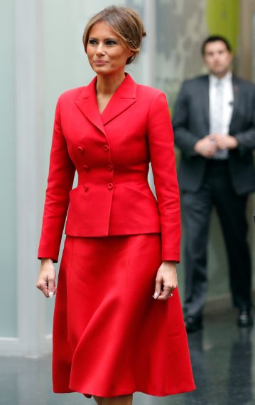Melania Trump ha visitato oggi l'ospedale pediatrico parigino Necker-Enfants Malades, passando dei dolci momenti con i bambini ricoverati. Per l'occasione ha osato con un look rosso fuoco, apparendo molto più audace rispetto al solito, visto che di solito sceglie tinte pastello e colori tenui. La First Lady ha sfoggiato un tailleur Dior con giacca avvitata e gonna a ruota lunga fin sotto al ginocchio.
