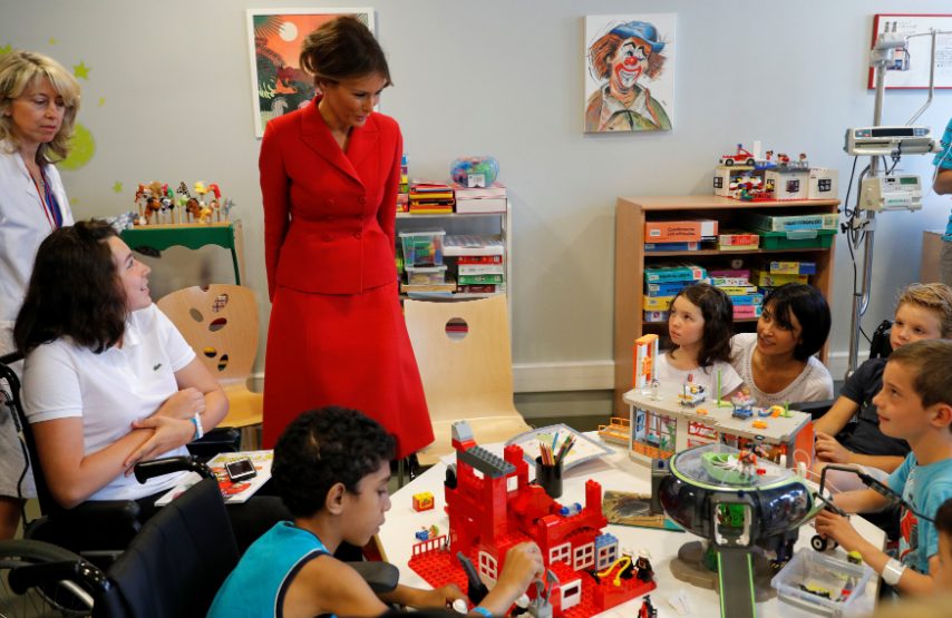 Melania Trump ha visitato oggi l'ospedale pediatrico parigino Necker-Enfants Malades, passando dei dolci momenti con i bambini ricoverati. Per l'occasione ha osato con un look rosso fuoco, apparendo molto più audace rispetto al solito, visto che di solito sceglie tinte pastello e colori tenui. La First Lady ha sfoggiato un tailleur Dior con giacca avvitata e gonna a ruota lunga fin sotto al ginocchio.
