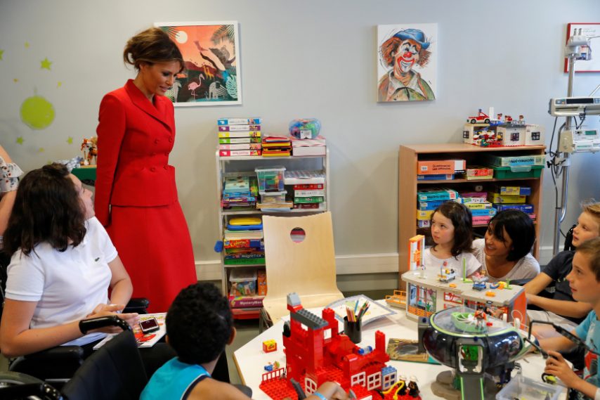 Melania Trump ha visitato oggi l'ospedale pediatrico parigino Necker-Enfants Malades, passando dei dolci momenti con i bambini ricoverati. Per l'occasione ha osato con un look rosso fuoco, apparendo molto più audace rispetto al solito, visto che di solito sceglie tinte pastello e colori tenui. La First Lady ha sfoggiato un tailleur Dior con giacca avvitata e gonna a ruota lunga fin sotto al ginocchio.