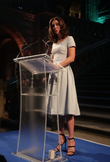 Kate Middleton ha preso parte all'evento organizzato per la riapertura del Museo di Storia Naturale, tenutosi ieri sera a Londra, e per l'occasione ha sfoggiato un look da fata turchina. Ha infatti indossato un abito celeste con una gonna a balza firmato Preen by Thornton Bregazzi ma non ha rinunciato ai tacchi a spillo.