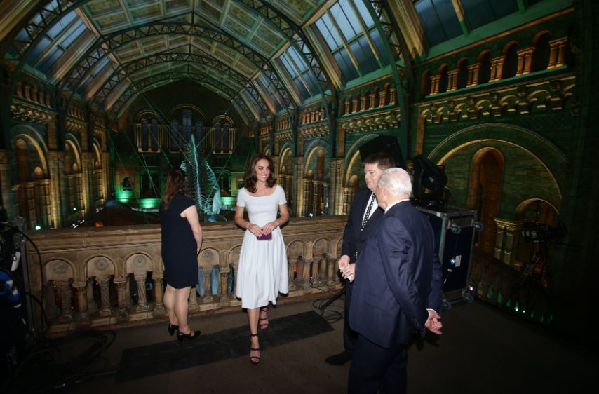 Kate Middleton ha preso parte all'evento organizzato per la riapertura del Museo di Storia Naturale, tenutosi ieri sera a Londra, e per l'occasione ha sfoggiato un look da fata turchina. Ha infatti indossato un abito celeste con una gonna a balza firmato Preen by Thornton Bregazzi ma non ha rinunciato ai tacchi a spillo.