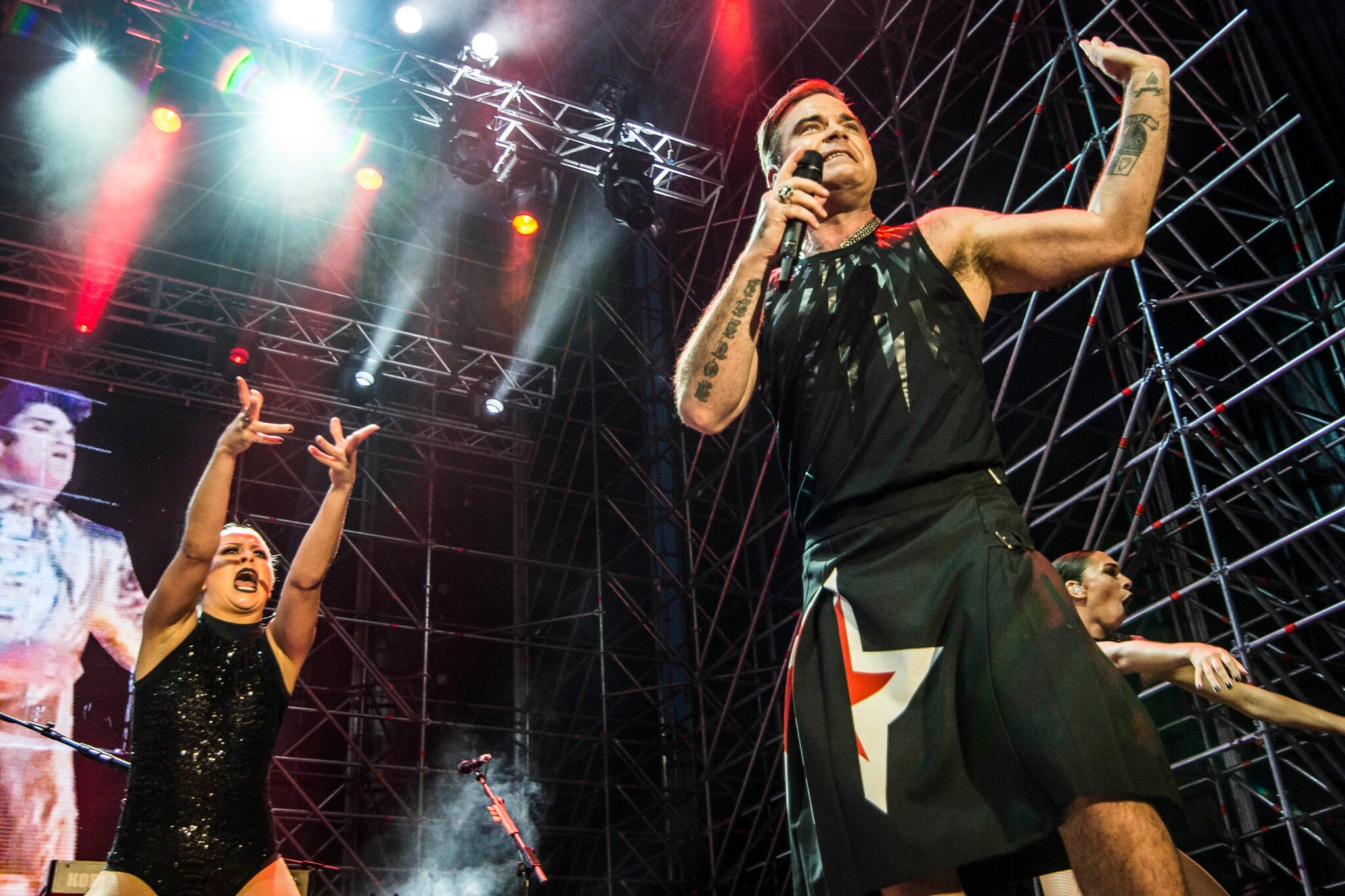 Robbie Williams si è esibito ieri sul palco del Collisioni Festival di Barolo e ancora una volta ha dimostrato di essere un sex symbol, nonostante i 43 anni. L'ex Take That ha sfoggiato un look insolito: ha infatti indossato canotta e gonna, rivelando lo slip con la tigre che ruggisce sulle parti intime mentre cantava "Rock Dj".