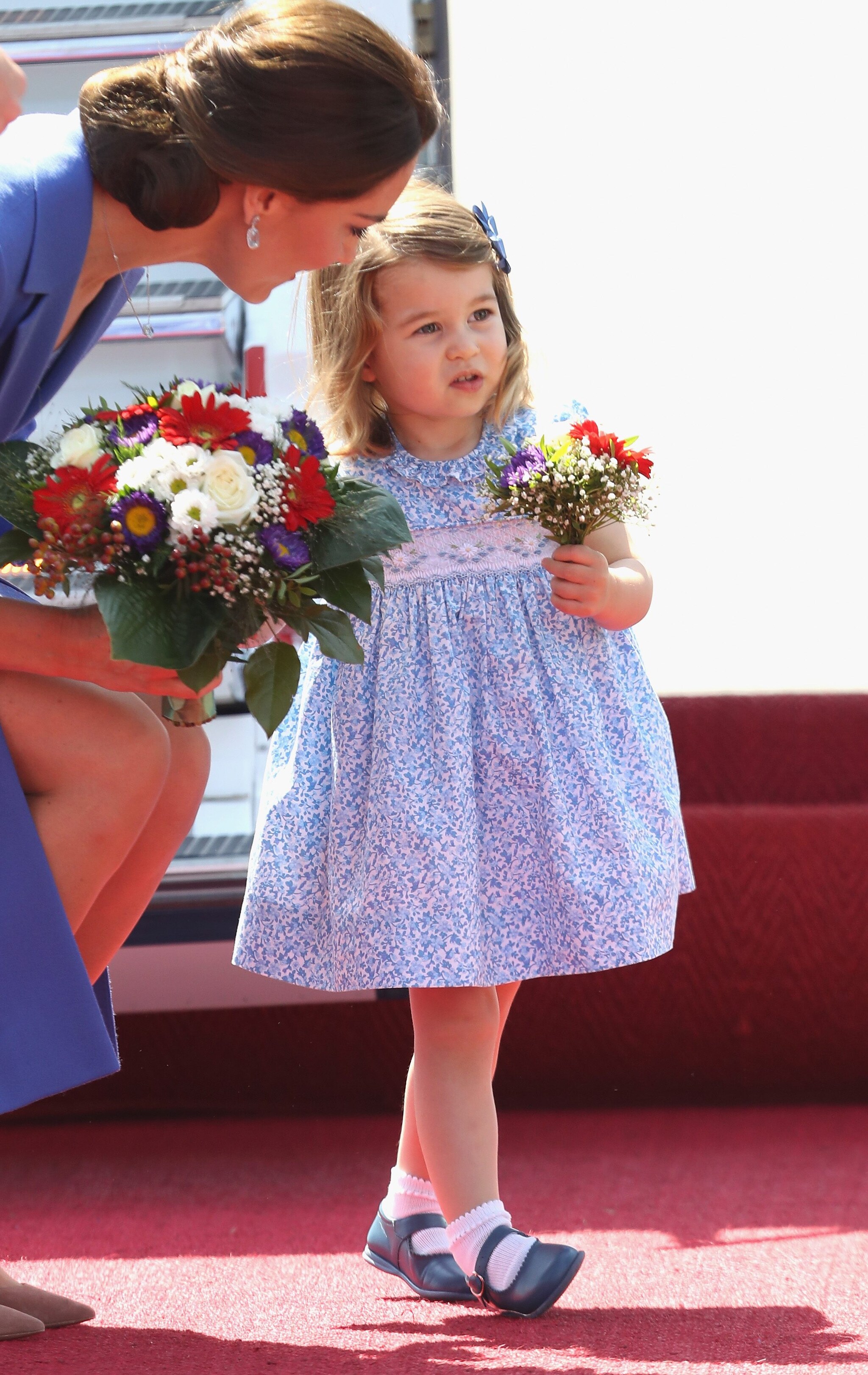 La Royal Family inglese è arrivata a Berlino e, fin da quando è atterrata l'aereo, ad attirare l'attenzione è stata la principessina Charlotte. La bimba è apparsa adorabile in un abitino a fiori sulle tonalità dell'azzurro, abbinato a quello di mamma Kate, anche lei in blu.