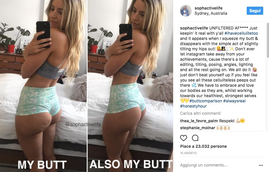 La foto pubblicata su Instagram da Sophie Allen è diventata virale, anche per il messaggio che la ragazza lancia, ovvero quello di non lasciarsi ingannare dalle apparenze. La 27enne australiana, una personal trainer che qualche anno fa ha rischiato di morire per l'endometriosi, ha postato due foto del suo fondoschiena che appare diverso: a sinistra si nota la cellulite, mentre a destra sembra non esserci. "Ho la cellulite che appare quando spremo il sedere e scompare semplicemente inclinando un po' i miei fianchi" scrive. In sostanza il messaggio rivolto agli utenti dei social media, che guardano con ammirazione ad alcune foto di star che sembrano "perfette", è di considerare anche l'angolo, l'inclinazione della posa e soprattutto un possibile ritocco con programmi di fotomontaggio delle immagini postate. "Dobbiamo amare i nostri corpi come sono" l'invito rivolto ai followers.