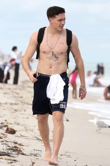 Brooklyn Beckham è stato avvistato sulle spiagge di Miami qualche giorno fa con indosso solo un costume da bagno, rivelando sia i numerosi tatuaggi che ha sul corpo che l'elastico dello slip. Il figlio maggiore di David e Victoria ha solo 18 anni ma ha già tutte le carte in regola per diventare un sex symbol.