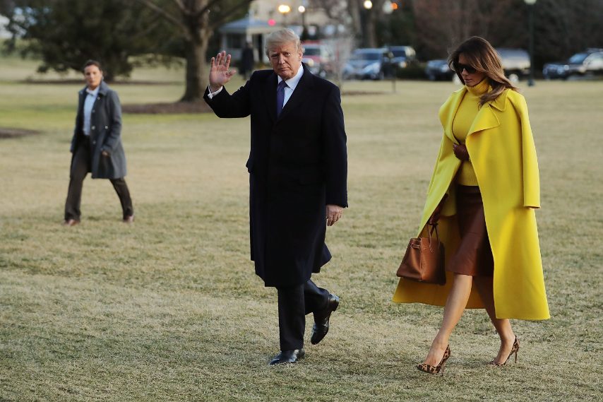Melania Trump è apparsa nuovamente al fianco di Donald Trump per una visita ufficiale in Ohio, dopo lo scandalo della scappatella con la pornostar che aveva coinvolto il Presidente. La First Lady ha scelto un look molto particolare per l'occasione: ha indossato cappottino e maglione a collo alto di Raloh Lauren giallo acceso, una gonna di pelle nocciola di Hervé Pierre e dei décolleté animalier di Manolo Blahnik.