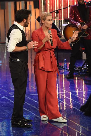 Dopo aver presentato la terza serata del Festival di Sanremo, Michelle Hunziker ha preso parte al DopoFestival, presentandosi in studio con un look originale. Anche lei non è riuscita a resistere alla tentazione dell'abito-pigiama e ha indossato un suit rosso della collezione Prefall di Alberta Ferretti, completando il tutto con delle sneakers bianche e un'acconciatura raccolta.