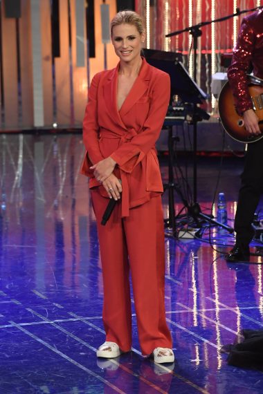 Dopo aver presentato la terza serata del Festival di Sanremo, Michelle Hunziker ha preso parte al DopoFestival, presentandosi in studio con un look originale. Anche lei non è riuscita a resistere alla tentazione dell'abito-pigiama e ha indossato un suit rosso della collezione Prefall di Alberta Ferretti, completando il tutto con delle sneakers bianche e un'acconciatura raccolta.