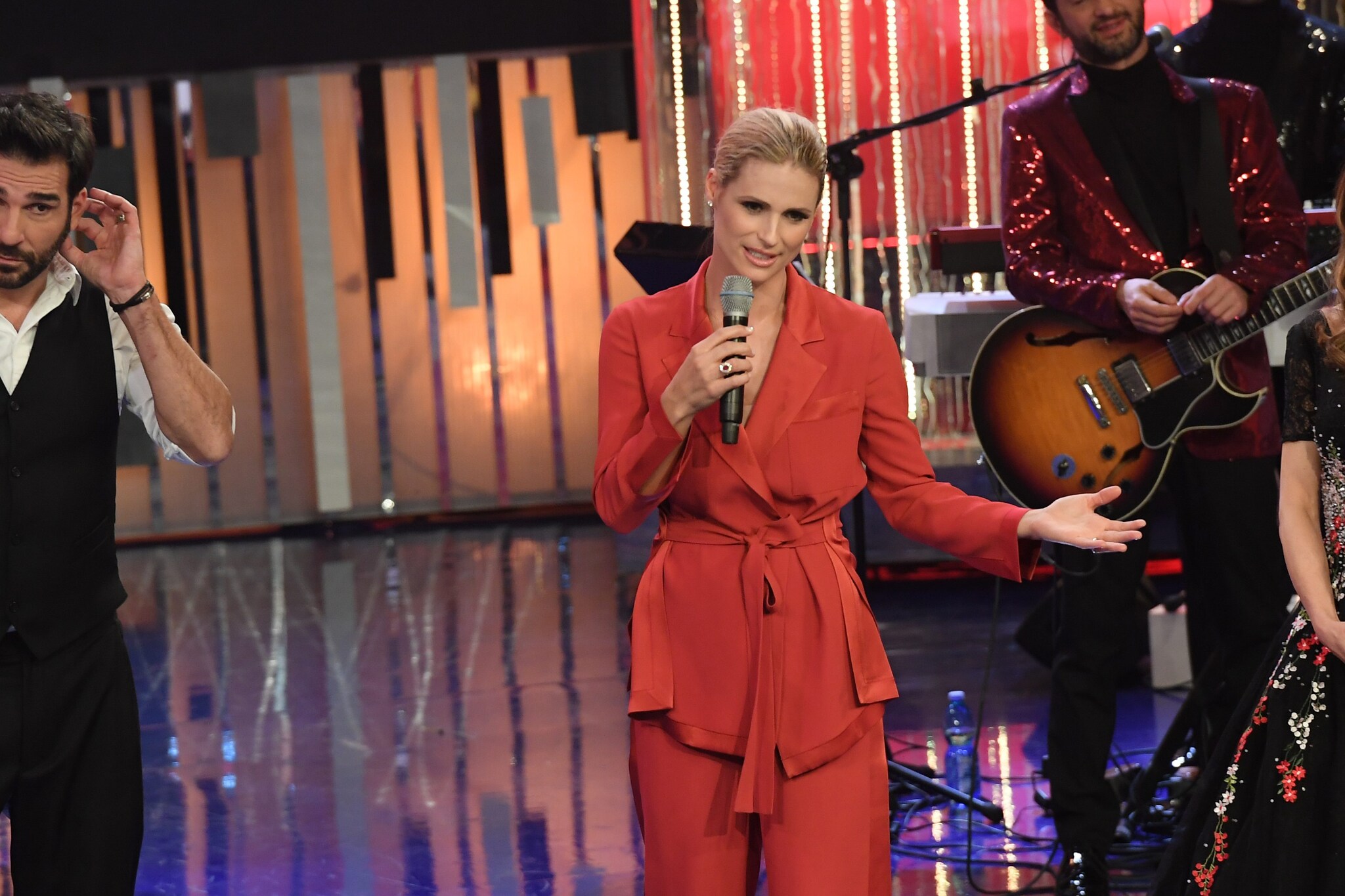 Dopo aver presentato la terza serata del Festival di Sanremo, Michelle Hunziker ha preso parte al DopoFestival, presentandosi in studio con un look originale. Anche lei non è riuscita a resistere alla tentazione dell'abito-pigiama e ha indossato un suit rosso della collezione Prefall di Alberta Ferretti, completando il tutto con delle sneakers bianche e un'acconciatura raccolta.