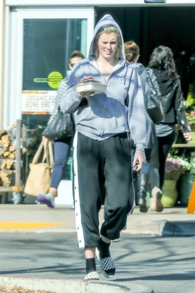 Ireland Baldwin in tuta e senza trucco