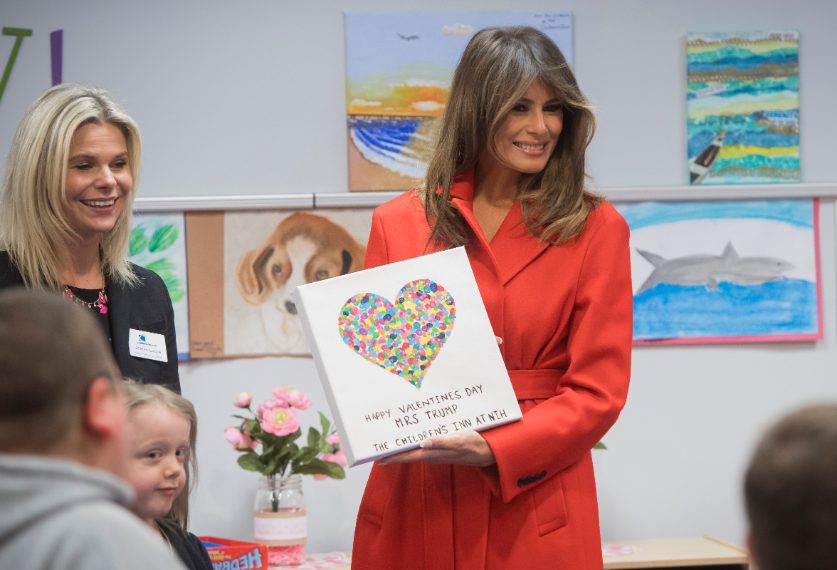 Melania Trump ha passato il suo San Valentino a lavorare e ha infatti fatto visita ai bambini malati dell'ospedale di Bathesda. Per l'occasione ha sfoggiato un elegante look rosso, caratterizzato da un lungo cappotto con una cintura in vita firmato Calvin Klein dal valore di 2.995 sterline.