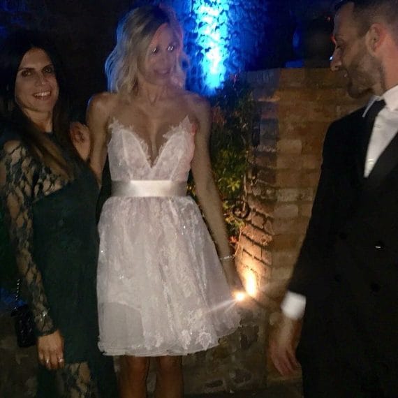 Simone Inzaghi e Gaia Lucariello hanno pronunciato il fatidico sì lo scorso sabato, organizzando una cerimonia da sogno a Montalcino. La sposa ha indossato un abito bianco senza spalline firmato Atelier Emé con scollo a cuore e gonna dal lungo strascico, completando il tutto con un velo di pizzo, un'acconciatura raccolta e dei gioielli Damiani. Durante il ricevimento si è poi cambiata, puntando tutto sulla sensualità con un vestito bianco in pizzo con minigonna e maxi scollatura.