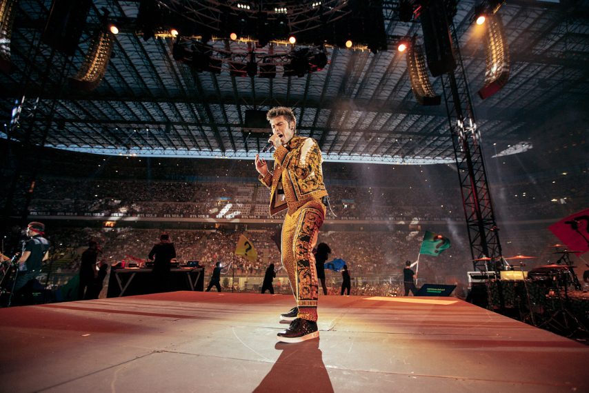 Lo scorso primo giugno Fedez e J-Ax hanno tenuto un mega concerto a San Siro chiamato "La finale" che ha segnato la fine del loro sodalizio artistico. Per un'occasione tanto speciale, il fidanzato di Chiara Ferragni è apparso più trendy che mai. Ha debuttato sul palco con un completo Versace decorato con l'iconica fantasia barocca della Maison e si è poi cambiato, puntando tutto su t-shirt, bermuda e slip Diesel.