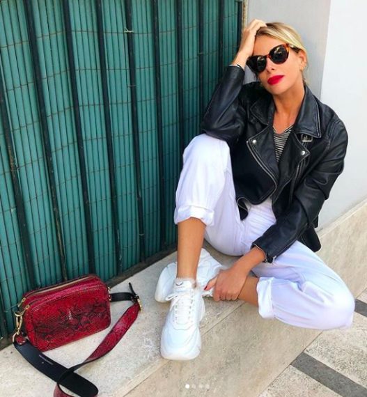 Alessia Marcuzzi con scarpe Voile Blanche e occhiali Max Mara