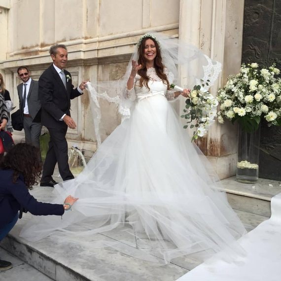 Ilenia Lazzarin, meglio conosciuta come Viola di "Un posto al sole", si è sposata lo scorso weekend a Positano, coronando il suo sogno d'amore con l'imprenditore napoletano Roberto Palmieri. E' incinta ma, nonostante il grosso pancione, non ha rinunciato all'abito bianco. Ne ha indossato uno di Atelier Emé con un corpetto in pizzo accollato e a maniche lunghe e una gonna di tulle con lo strascico, completando il tutto con un lungo velo, una coroncina di fiori e delle scarpe con il tacco di Albano