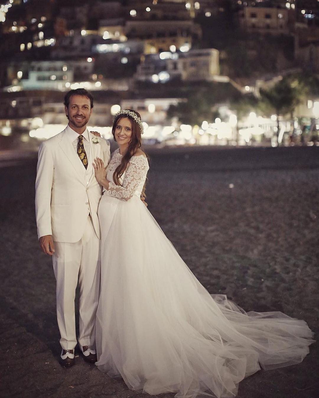 Ilenia Lazzarin, meglio conosciuta come Viola di "Un posto al sole", si è sposata lo scorso weekend a Positano, coronando il suo sogno d'amore con l'imprenditore napoletano Roberto Palmieri. E' incinta ma, nonostante il grosso pancione, non ha rinunciato all'abito bianco. Ne ha indossato uno di Atelier Emé con un corpetto in pizzo accollato e a maniche lunghe e una gonna di tulle con lo strascico, completando il tutto con un lungo velo, una coroncina di fiori e delle scarpe con il tacco di Albano