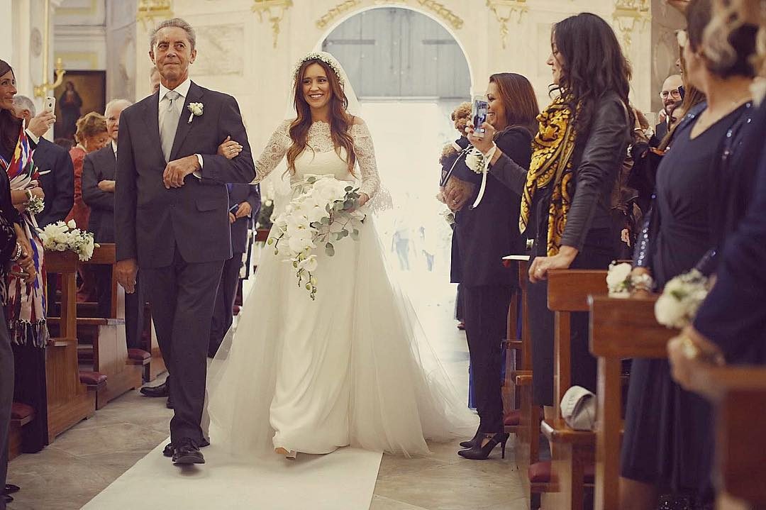 Ilenia Lazzarin, meglio conosciuta come Viola di "Un posto al sole", si è sposata lo scorso weekend a Positano, coronando il suo sogno d'amore con l'imprenditore napoletano Roberto Palmieri. E' incinta ma, nonostante il grosso pancione, non ha rinunciato all'abito bianco. Ne ha indossato uno di Atelier Emé con un corpetto in pizzo accollato e a maniche lunghe e una gonna di tulle con lo strascico, completando il tutto con un lungo velo, una coroncina di fiori e delle scarpe con il tacco di Albano