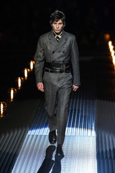 Prada ha presentato la collezione Autunno/Inverno 2019-20 durante la Milano Fashion Week dedicata alla moda Uomo. La Maison ha fatto sfilare i modelle in una location "ovattata", illuminata solo da un suggestivo tappeto di lampade, che aveva l'obiettivo di mettere in risalto l'umanità della linea. Pantaloni larghi e lunghi fino al ginocchio, giacche scostate da corpo, capispalla militari, sono solo alcuni dei capi con cui la stilista della griffe è voluta tornare alle origini.