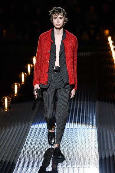 Prada ha presentato la collezione Autunno/Inverno 2019-20 durante la Milano Fashion Week dedicata alla moda Uomo. La Maison ha fatto sfilare i modelle in una location "ovattata", illuminata solo da un suggestivo tappeto di lampade, che aveva l'obiettivo di mettere in risalto l'umanità della linea. Pantaloni larghi e lunghi fino al ginocchio, giacche scostate da corpo, capispalla militari, sono solo alcuni dei capi con cui la stilista della griffe è voluta tornare alle origini.