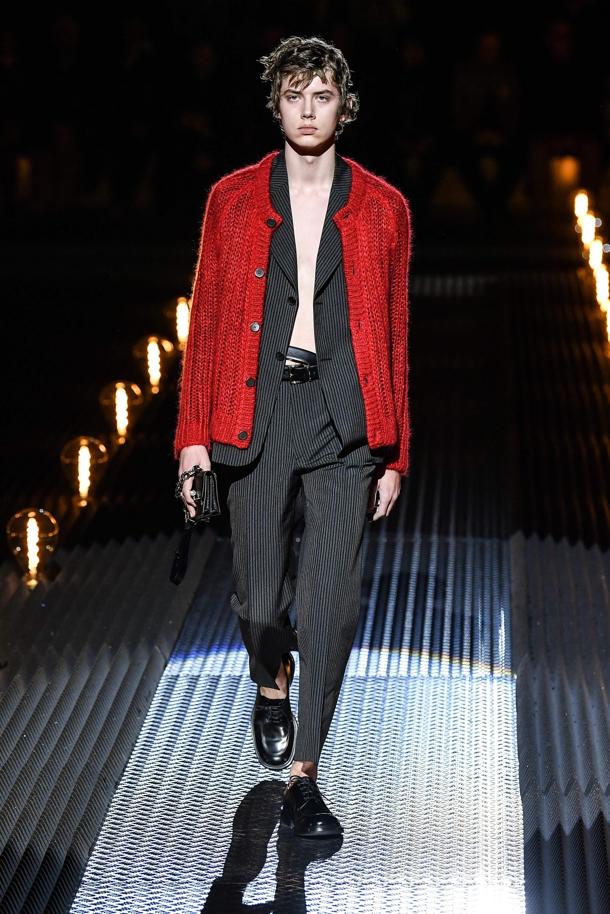 Prada ha presentato la collezione Autunno/Inverno 2019-20 durante la Milano Fashion Week dedicata alla moda Uomo. La Maison ha fatto sfilare i modelle in una location "ovattata", illuminata solo da un suggestivo tappeto di lampade, che aveva l'obiettivo di mettere in risalto l'umanità della linea. Pantaloni larghi e lunghi fino al ginocchio, giacche scostate da corpo, capispalla militari, sono solo alcuni dei capi con cui la stilista della griffe è voluta tornare alle origini.