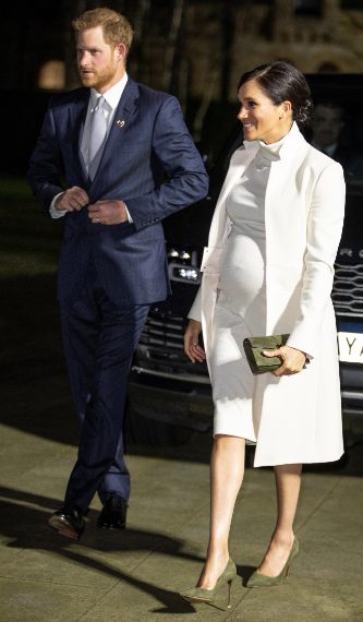 Meghan Markle ha preso parte a un evento ufficiale al Natural History Museum di Londra in compagnia del principe Harry e per l'occasione ha sfoggiato un look premaman total white. Ha infatti indossato un abito al ginocchio di Calvin Klein che le ha fasciato il pancione, un cappotto Amanda Wakeley portato sbottonato e degli accessori a contrasto verde oliva, ovvero i décolleté con il tacco di Sergio Rossi e la clutch bag di Ralph Lauren.