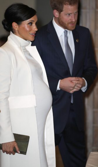 Meghan Markle ha preso parte a un evento ufficiale al Natural History Museum di Londra in compagnia del principe Harry e per l'occasione ha sfoggiato un look premaman total white. Ha infatti indossato un abito al ginocchio di Calvin Klein che le ha fasciato il pancione, un cappotto Amanda Wakeley portato sbottonato e degli accessori a contrasto verde oliva, ovvero i décolleté con il tacco di Sergio Rossi e la clutch bag di Ralph Lauren.