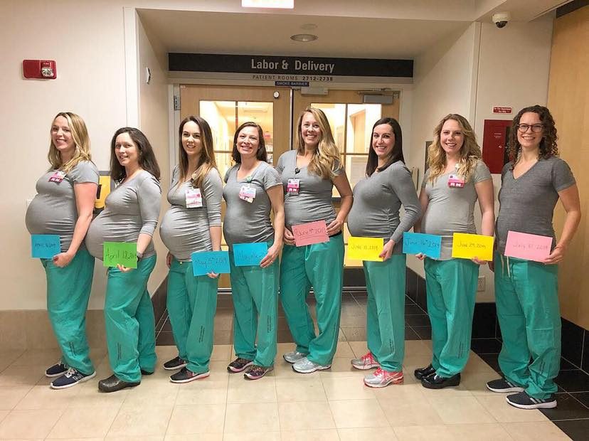 9 delle infermiere (8 in foto) che lavorano nello stesso reparto sono rimaste incinte nello stesso periodo. Le donne hanno fatto alcuni scatti, tra cui quello con dei cartelli dove hanno scritto la data del parto.