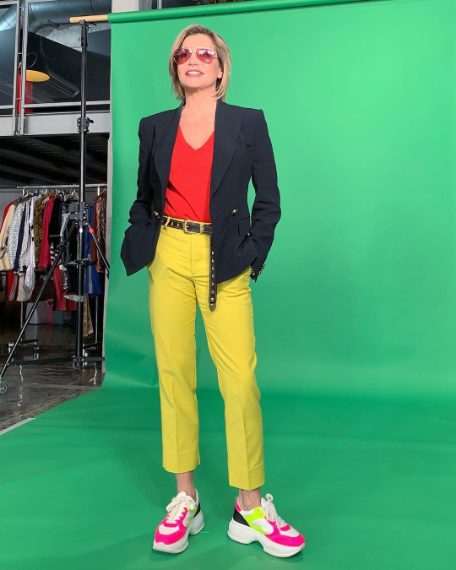 • Simona Ventura con il completo colorato di Fausto Puglisi
