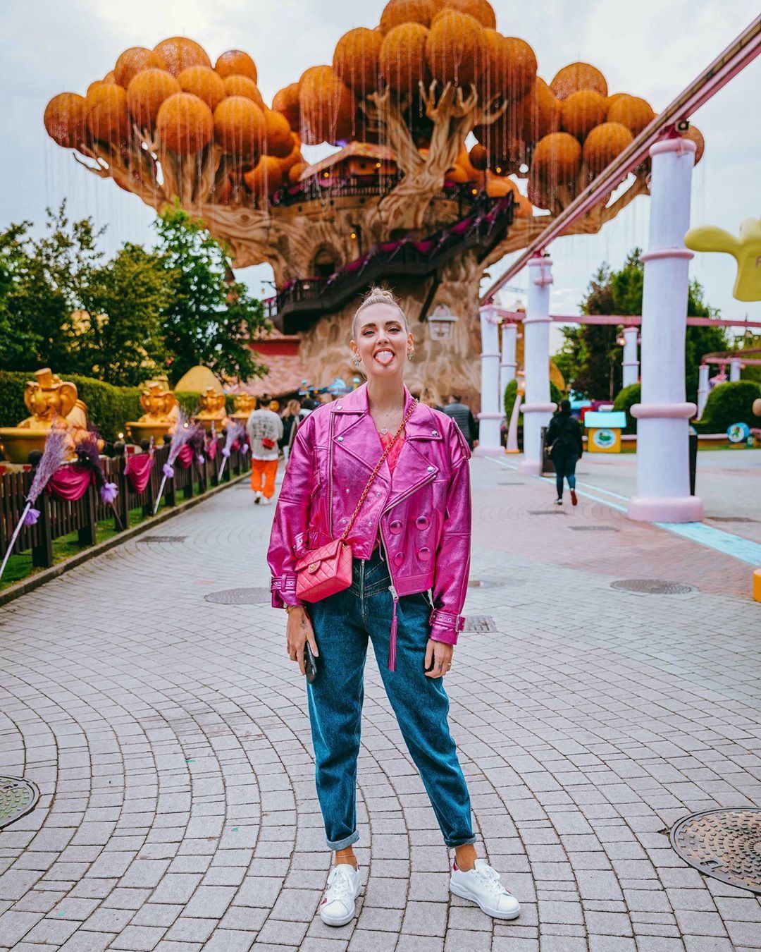 A più di una settimana di distanza dal compleanno, Chiara Ferragni ha finalmente festeggiato i suoi 32 anni con una festa spettacolare. Ha affittato per una serata il parco divertimenti Gardaland e per l'occasione ha sfoggiato un look total pink firmato Attico con top di piume, jeans a vita alta, chiodo di pelle "metallico" e make-up abbinato.