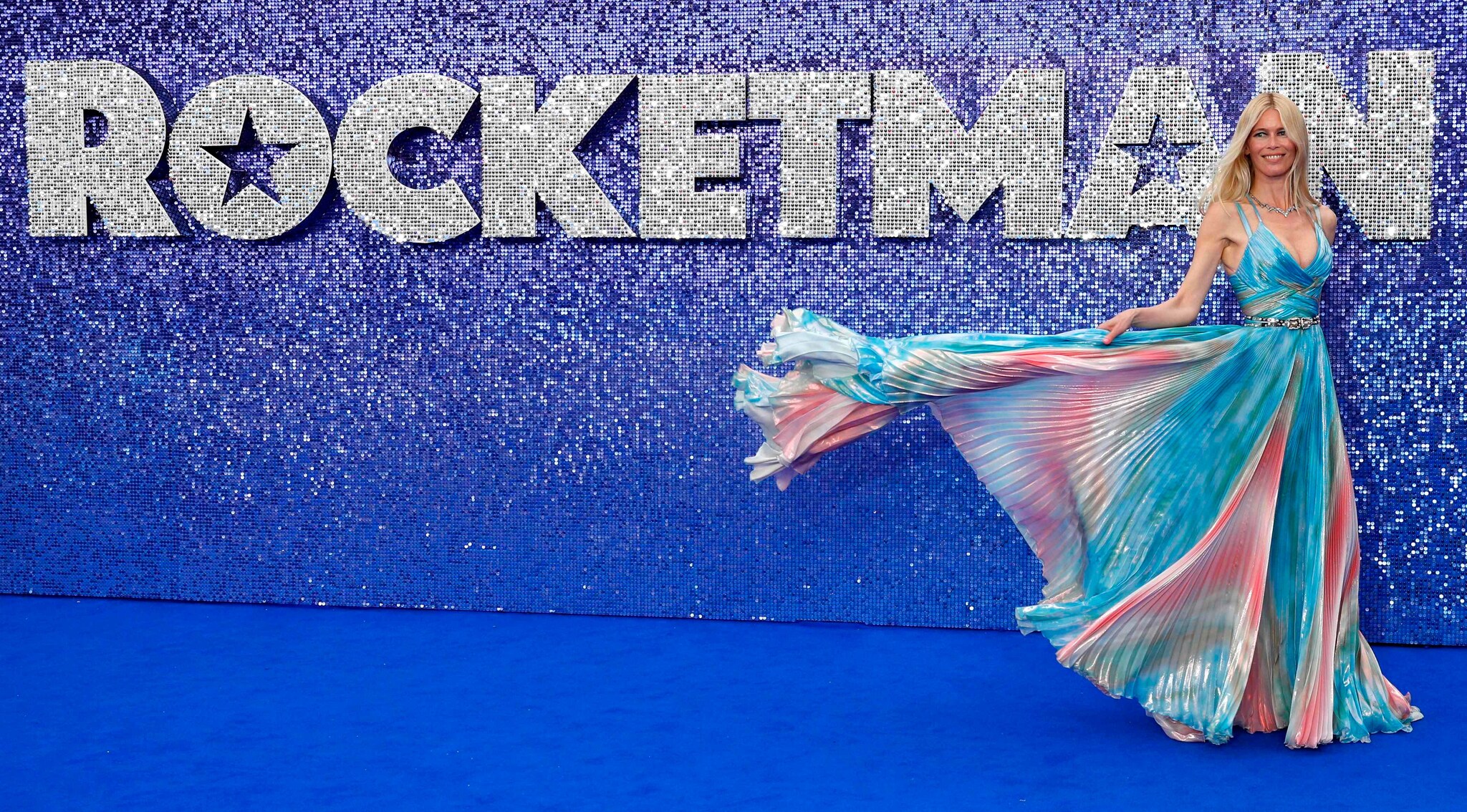 Claudia Schiffer con l'abito arcobaleno alla prima di "Rocketman"