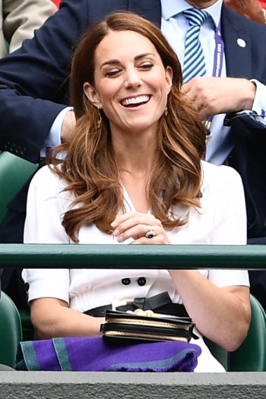 Kate Middleton ha preso parte al secondo giorno di gare del torneo di Wimbledon, evento di cui è madrina. Per l'occasione ha sfoggiato un look elegantissimo con un abito chemisier total white di Suzannah, i décolleté di Gianvito Rossi e una minibag di Alexander McQueen.