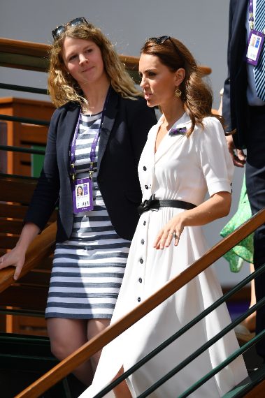 Kate Middleton ha preso parte al secondo giorno di gare del torneo di Wimbledon, evento di cui è madrina. Per l'occasione ha sfoggiato un look elegantissimo con un abito chemisier total white di Suzannah, i décolleté di Gianvito Rossi e una minibag di Alexander McQueen.
