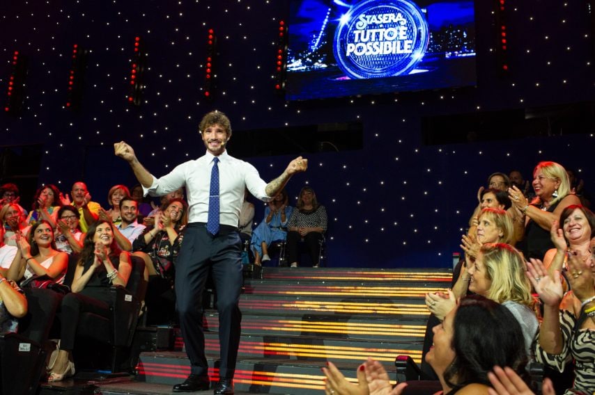 Stefano De Martino con la cravatta a "Stasera tutto è possibile"