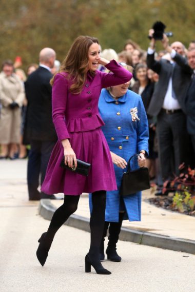Kate Middleton ha partecipato all'inaugurazione del Nook Children Hospice e per l'occasione ha sfoggiato un elegante tailleur di Oscar de la Renta di color magenta. Per completare il tutto ha scelto dei décolleté con il tacco largo di Gianvito Rossi e delle calze coprenti che hanno sostituito quelle nude che è costretta a indossare anche in estate per rispettare il protocollo.