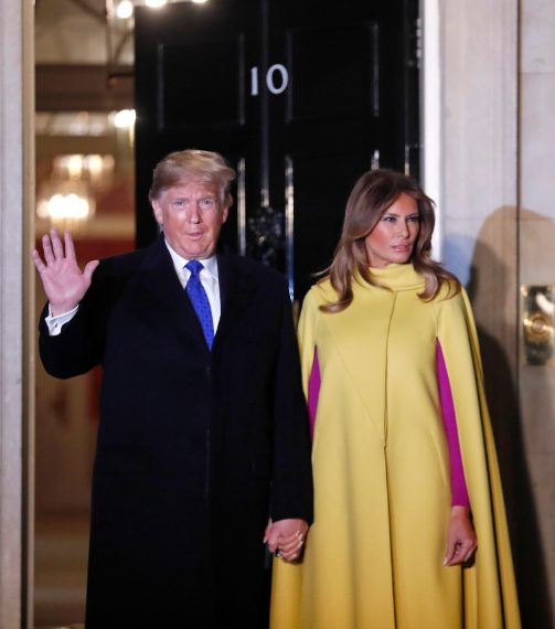 Melania Trump è volata a Londra con Donald per prendere parte a una serata di gala organizzata a Buckingham Palace per i 70 anni della Nato e per l'occasione ha sfoggiato un look color block super trendy. Ha infatti indossato una mantella gialla di Valentino da quasi 5.000 euro, abbinandola a un paio di décolleté Louboutin in camoscio fucsia.