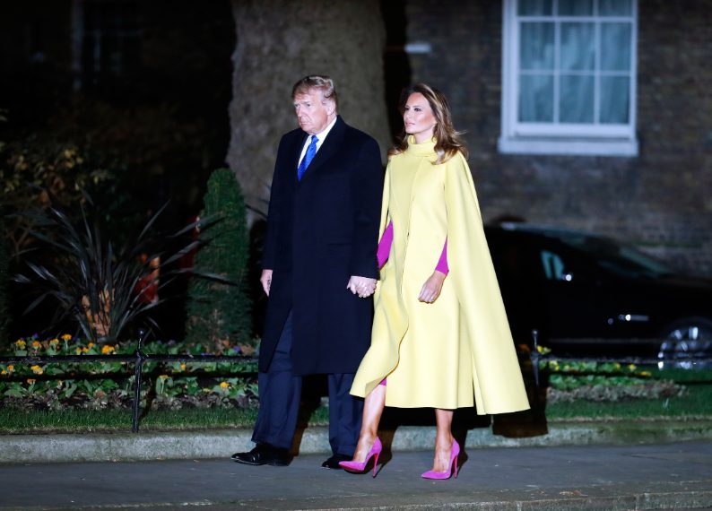 Melania Trump è volata a Londra con Donald per prendere parte a una serata di gala organizzata a Buckingham Palace per i 70 anni della Nato e per l'occasione ha sfoggiato un look color block super trendy. Ha infatti indossato una mantella gialla di Valentino da quasi 5.000 euro, abbinandola a un paio di décolleté Louboutin in camoscio fucsia.