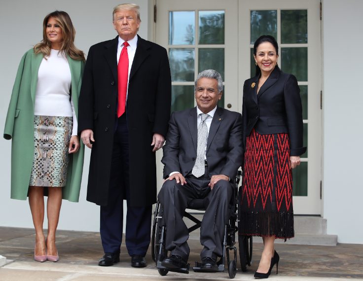 Melania Trump e suo marito Donald hanno accolto il Presidente dell'Ecuador e sua moglie alla Casa Bianca. Per l'occasione la First Lady ha sfoggiato una gonna a matita in pelle di pitone di Salvatore Ferragamo da oltre 7.000 euro. Per completare il tutto ha scelto un cappottino verde portato sulle spalle, un maglione bianco e dei décolleté color cipria di Manolo Blahnik.