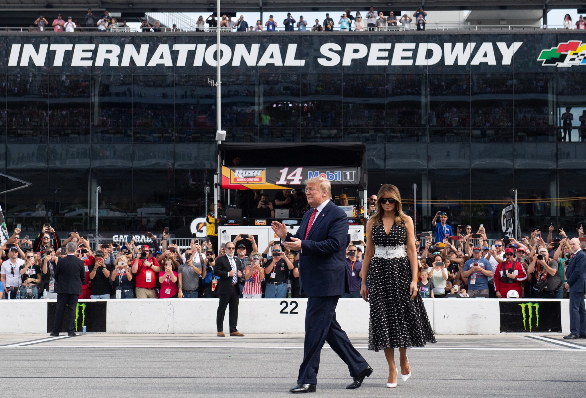 Donald e Melania Trump hanno partecipato alla 500 miglia di Daytona ma è stata la First Lady con il suo look ad attirare le attenzioni del pubblico. Ha infatti dato un piccolo anticipo di primavera con un abito a pois firmato Dior, al quale ha abbinato un paio di décolleté bianchi di Louboutin.