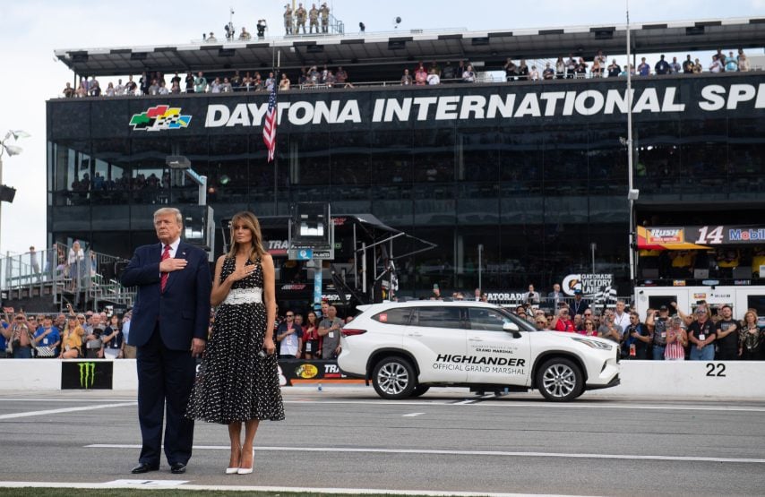Donald e Melania Trump hanno partecipato alla 500 miglia di Daytona ma è stata la First Lady con il suo look ad attirare le attenzioni del pubblico. Ha infatti dato un piccolo anticipo di primavera con un abito a pois firmato Dior, al quale ha abbinato un paio di décolleté bianchi di Louboutin.