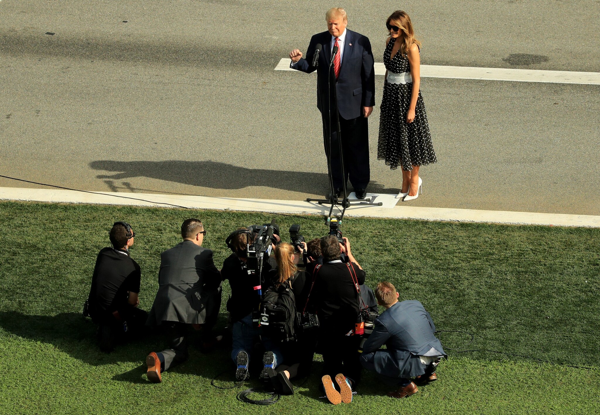 Donald e Melania Trump hanno partecipato alla 500 miglia di Daytona ma è stata la First Lady con il suo look ad attirare le attenzioni del pubblico. Ha infatti dato un piccolo anticipo di primavera con un abito a pois firmato Dior, al quale ha abbinato un paio di décolleté bianchi di Louboutin.