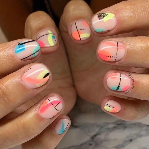 Sono coloratissime, vivaci e creative: le unghie dell'estate 2020 seguono la tendenza abstract nails che si ispira al movimento artistico che porta lo stesso nome. Se nei primi anni del '900 pittori come  Mondrian e Kandinskij coloravano le loro tele con schizzi, sfumature e linee che esulavano dalla rappresentazione realistica di oggetti e persone, oggi tutto ciò è ricreato sulle unghie. Non esiste nessuna regola precisa se non quella di liberare la propria creatività e giocare con i colori. Così come per l'arte anche la per la manicure diventano protagonisti colori, linee morbide accanto ad altre geometriche, forme astratte e macchie di colori accessi accostate a basi neutre e delicate.