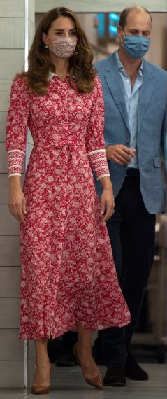 Kate Middleton è tornata al lavoro, insieme al marito ha fatto visita a un panificio a Londra e per l'occasione ha dato il meglio di lei in fatto di look. Ha sfoggiato un abito a fiori sui toni del rosso, un modello riciclato di Beulah London, abbinandolo a una mascherina coordinata di Amaia.