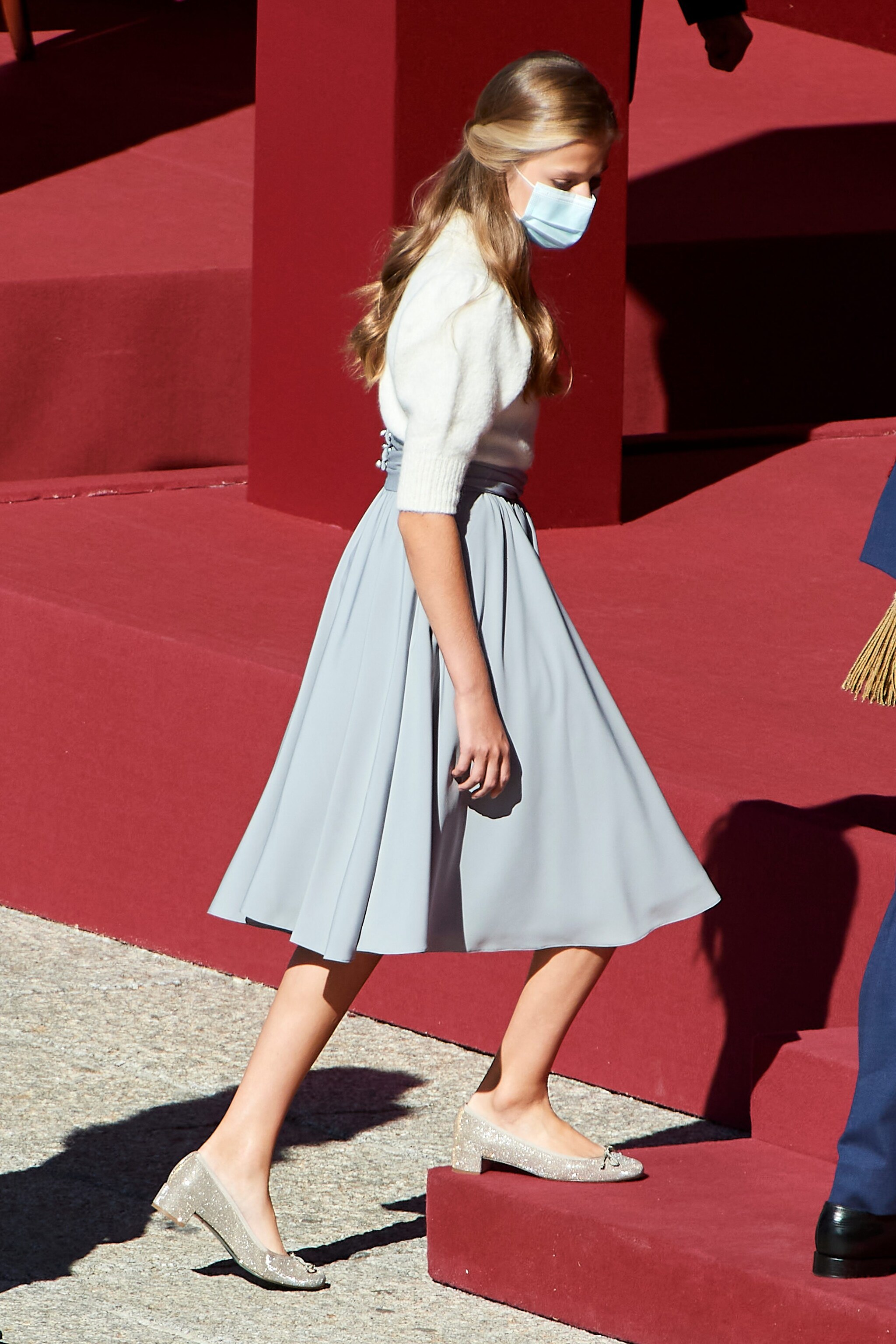 Leonor di Spagna ha partecipato con la famiglia alle celebrazioni del National Day e per l'occasione ha rivoluzionato il suo stile. Ha detto addio alle scarpe raso terra, ha indossato per la prima volta i tacchi, per la precisione un paio di mocassini di Mascarò con un tacco quadrato e di qualche centimetro.