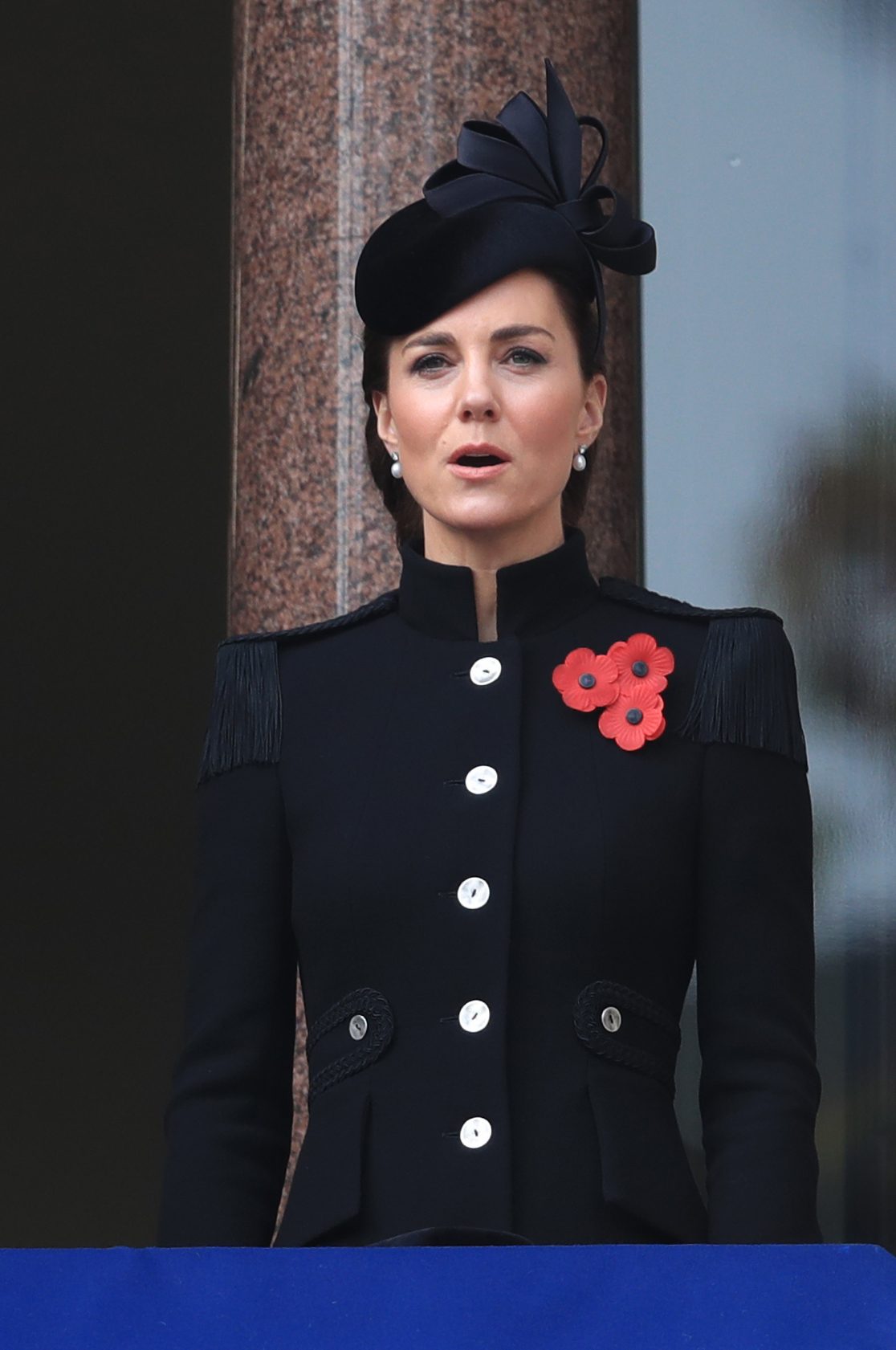 Kate Middleton ci tiene molto all'etichetta e al protocollo: ha sempre rispettato tutte le norme di comportamento e di stile imposte a una duchessa. Il suo look è solitamente colorato e sbarazzino, con una predilezione per abitini e tubini. Spesso ha anche sfoggiato capi low cost, molto apprezzati dai suoi fan. In occasione della domenica della memoria, ha però cambiato decisamente stile a favore di un outfit austero e di richiamo militare: cappotto nero Catherine Walker, cappello con fiocco firmato Philip Treacy e a completare il tutto spilla con papaveri e orecchini pendenti con diamanti e perle.