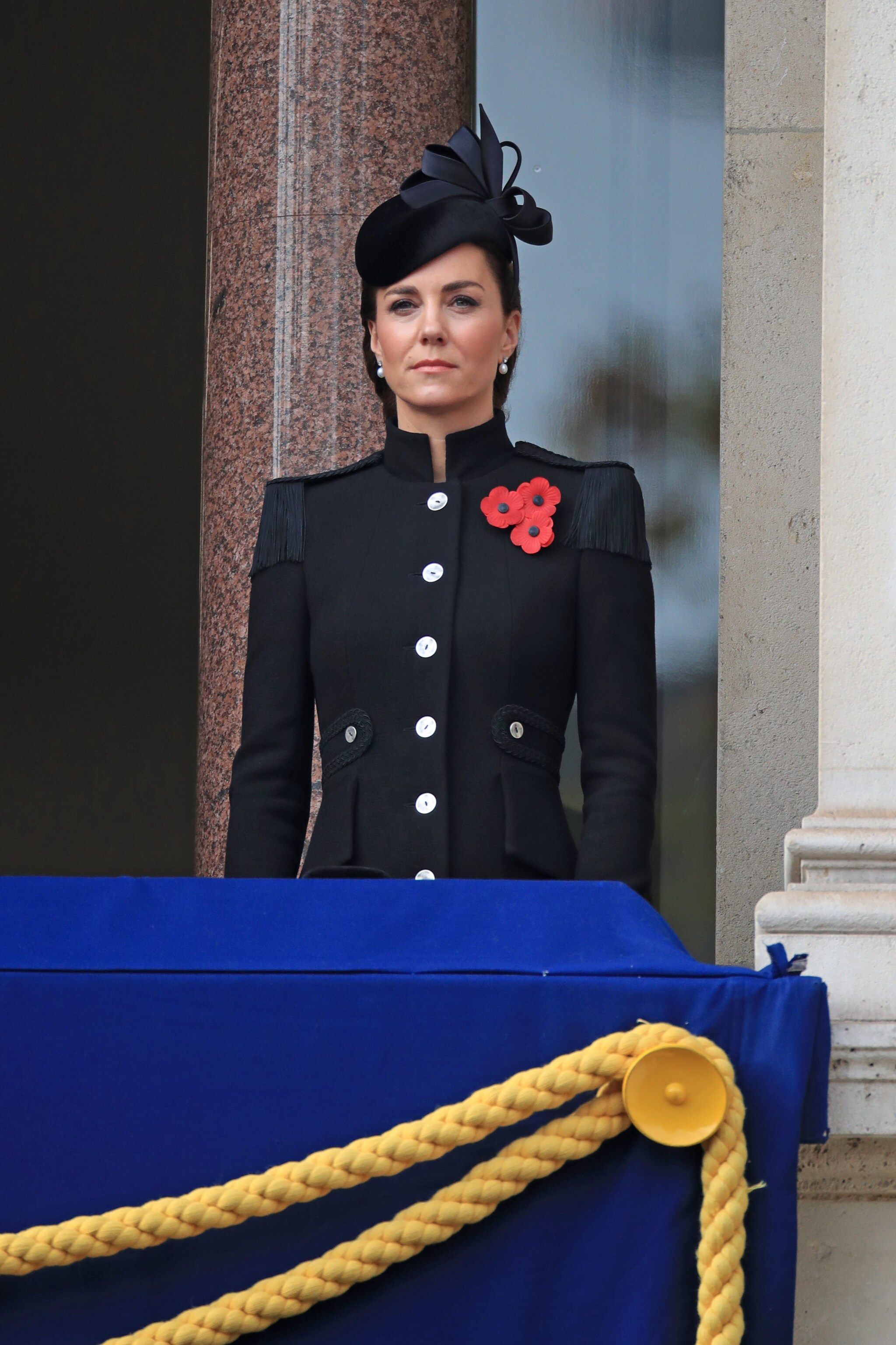 Kate Middleton ci tiene molto all'etichetta e al protocollo: ha sempre rispettato tutte le norme di comportamento e di stile imposte a una duchessa. Il suo look è solitamente colorato e sbarazzino, con una predilezione per abitini e tubini. Spesso ha anche sfoggiato capi low cost, molto apprezzati dai suoi fan. In occasione della domenica della memoria, ha però cambiato decisamente stile a favore di un outfit austero e di richiamo militare: cappotto nero Catherine Walker, cappello con fiocco firmato Philip Treacy e a completare il tutto spilla con papaveri e orecchini pendenti con diamanti e perle.