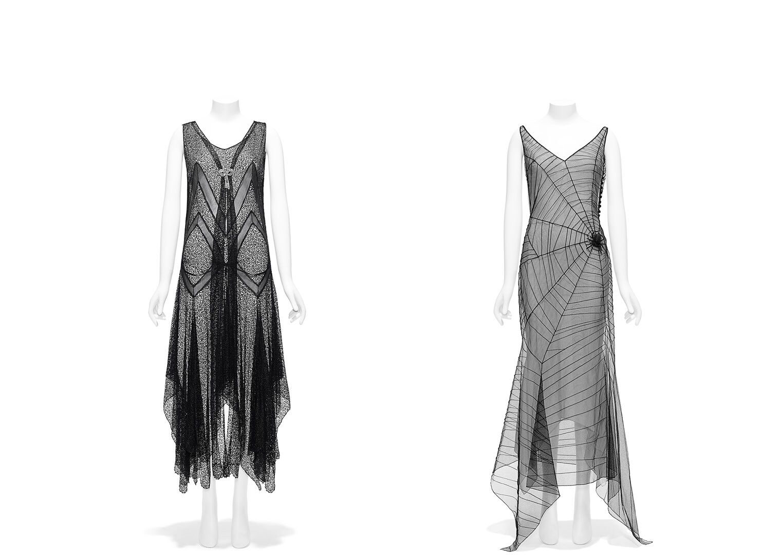 (Left) Timeline: Evening dress, ca. 1928. Probably American. The Metropolitan Museum of Art, New York, Gift of Richard Martin and Harold Koda, 1992 (1992.399a, b) (Right) Interruption: John Galliano (British, born Gibraltar, 1960). Dress, spring/summer 1997, edition 2008. Gift of John Galliano, 2012 (2012.122)