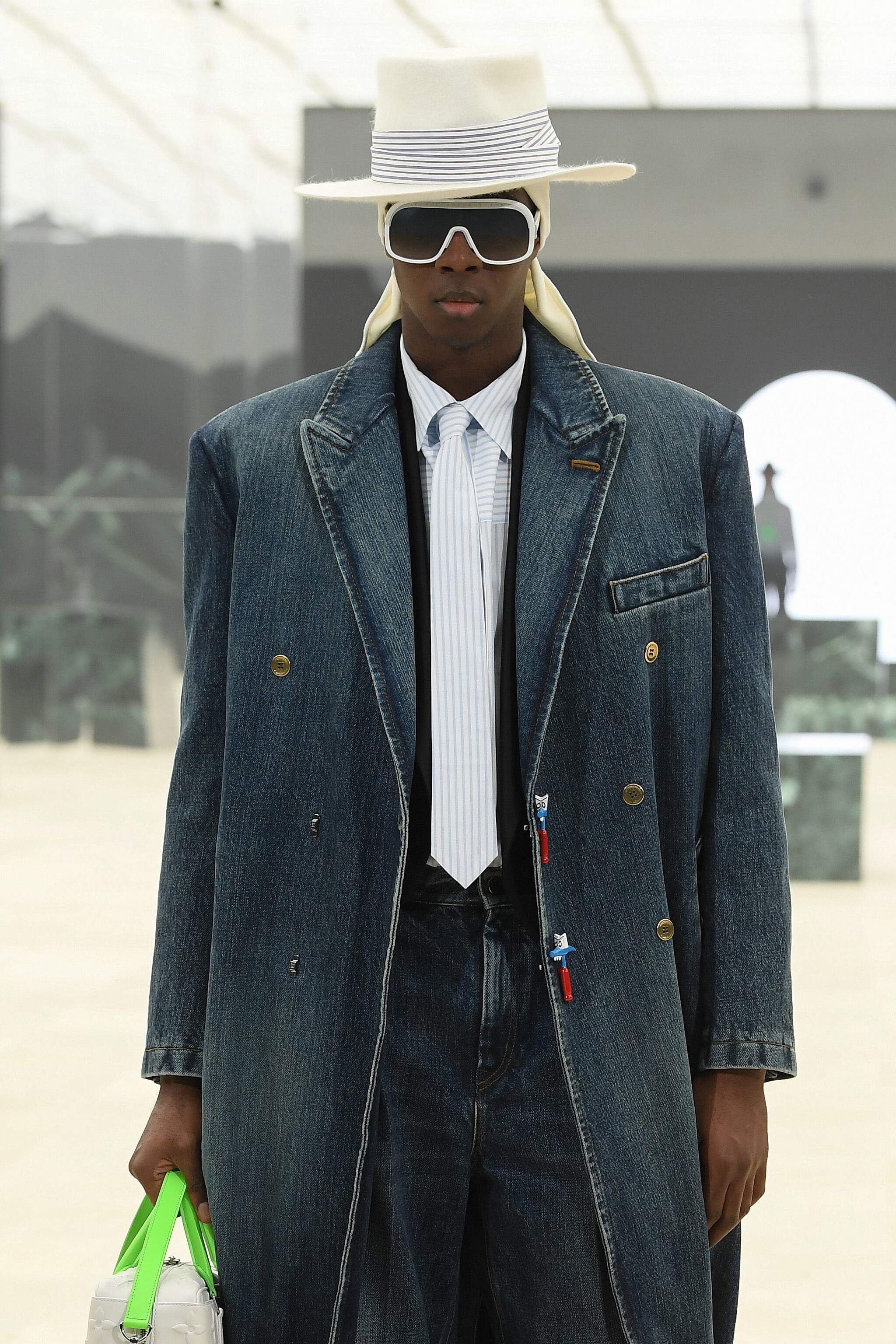 Il designer Virgil Abloh scardina tutte le convenzioni dell'abbigliamento maschile e immagina i classici in una chiave nuova e anticonvenzionale: dal gessato al cappotto doppiopetto, dalla tuta da pilota al cardigan in lana. Sono i dettagli a fare la differenza: borsoni colorati, bottoni a forma di aeroplanino, occhiali vintage e stivali texani